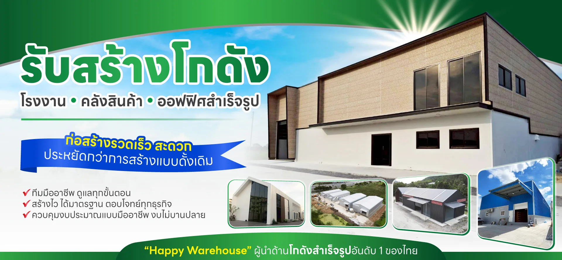 สร้างโกดังสำเร็จรูป ไม่ยากอย่างที่คิด Happy Warehouse ผู้นำด้านระบบการก่อสร้างโกดังสำเร็จรูป อันดับ 1 ของเมืองไทย ดูแลทุกขั้นตอน ตั้งแต่วางแผน ออกแบบ ก่อสร้าง ไปจนถึงส่งมอบ พร้อมควบคุมงบประมาณแบบมืออาชีพ สร้างไว ไม่ต้องรอนาน ได้มาตรฐานตามหลักวิศวกรรม ไม่ว่าจะโครงสร้างโกดังสำเร็จรูป โรงงาน และอาคารขนาดใหญ่ เราสร้างให้ได้แบบมืออาชีพ ควบคุมต้นทุนได้ ไม่เสี่ยงงบบานปลาย ตอบโจทย์ทุกธุรกิจ